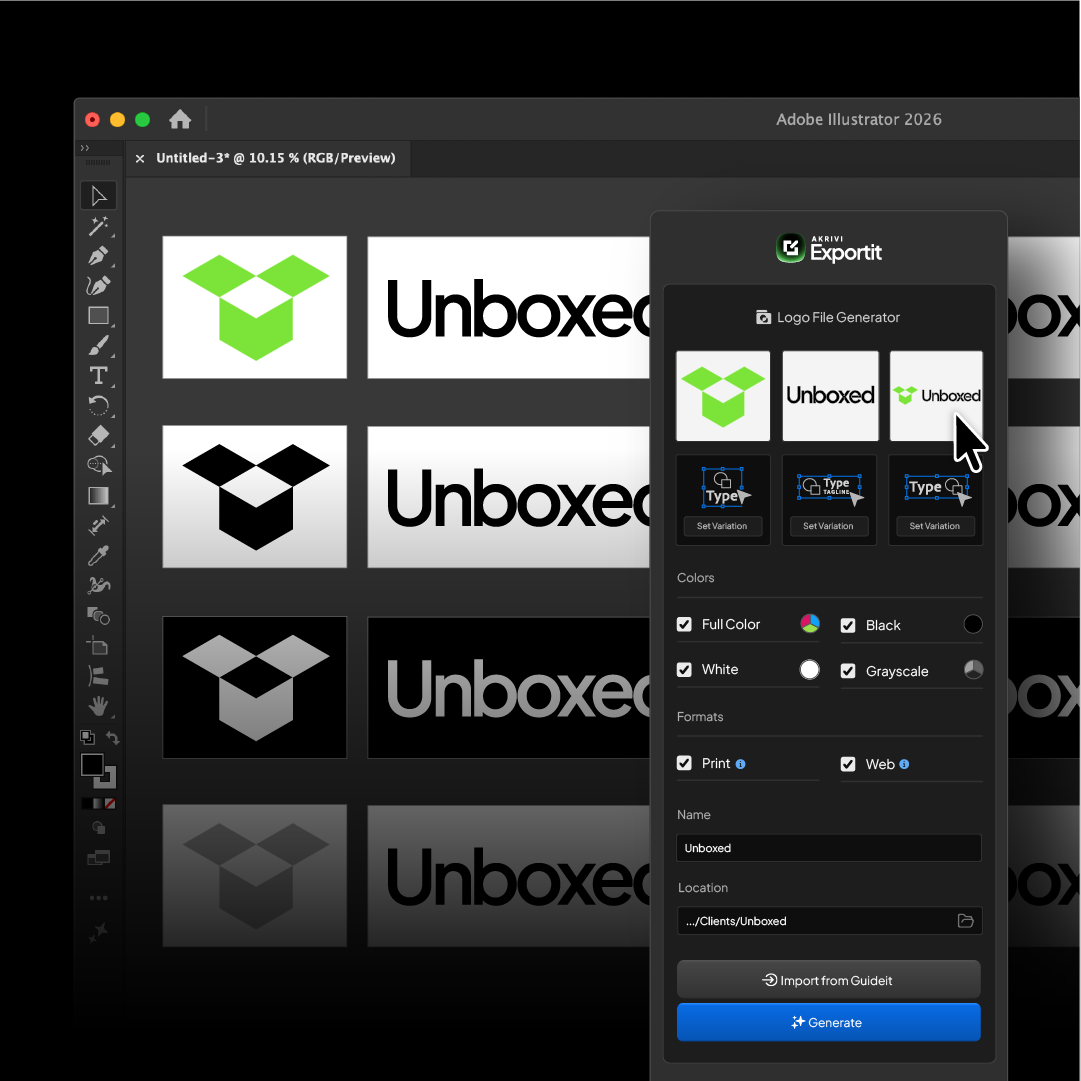 Start now and generate logo grids, bento layouts, and brand guidelines instantly — all inside Illustrator with Akrivi Studio.