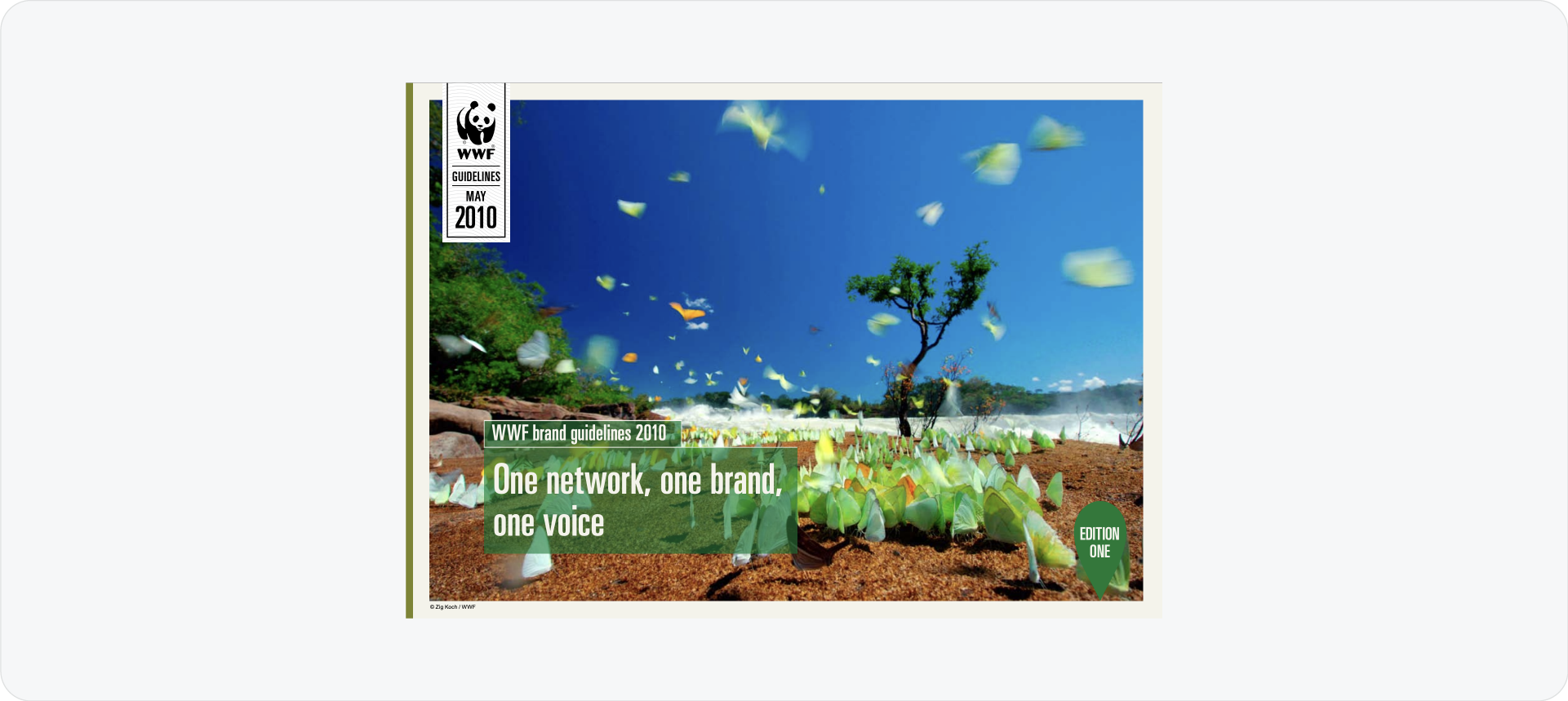 WWF's brand guidelines open with their core positioning statement and go straight into how it shapes every communication decision — tone, language, and storytelling alongside logo and colour rules.