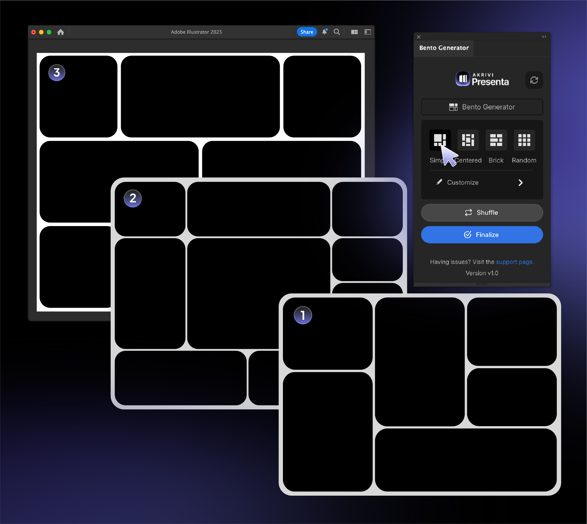 Instantly generate bento grid layouts for your logo presentations, switch styles in one click, and customise everything — with the Presenta Adobe Illustrator plugin.