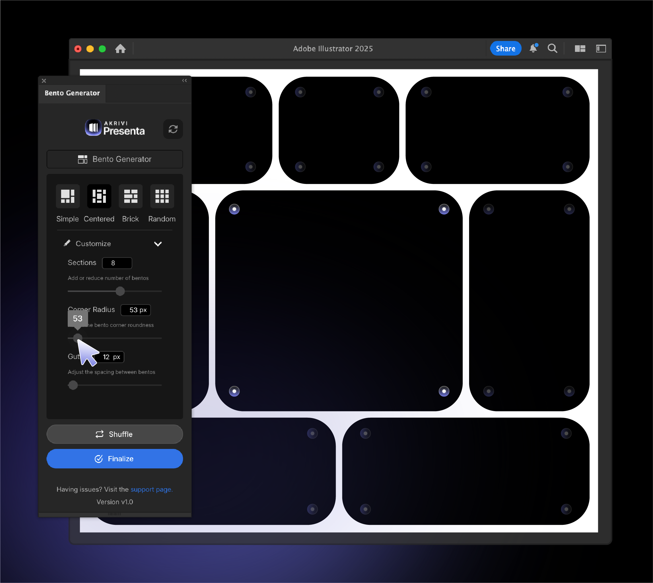 Adjust box count, spacing, and corner radius instantly — with live previews and smooth dynamic sliders built right into Illustrator.